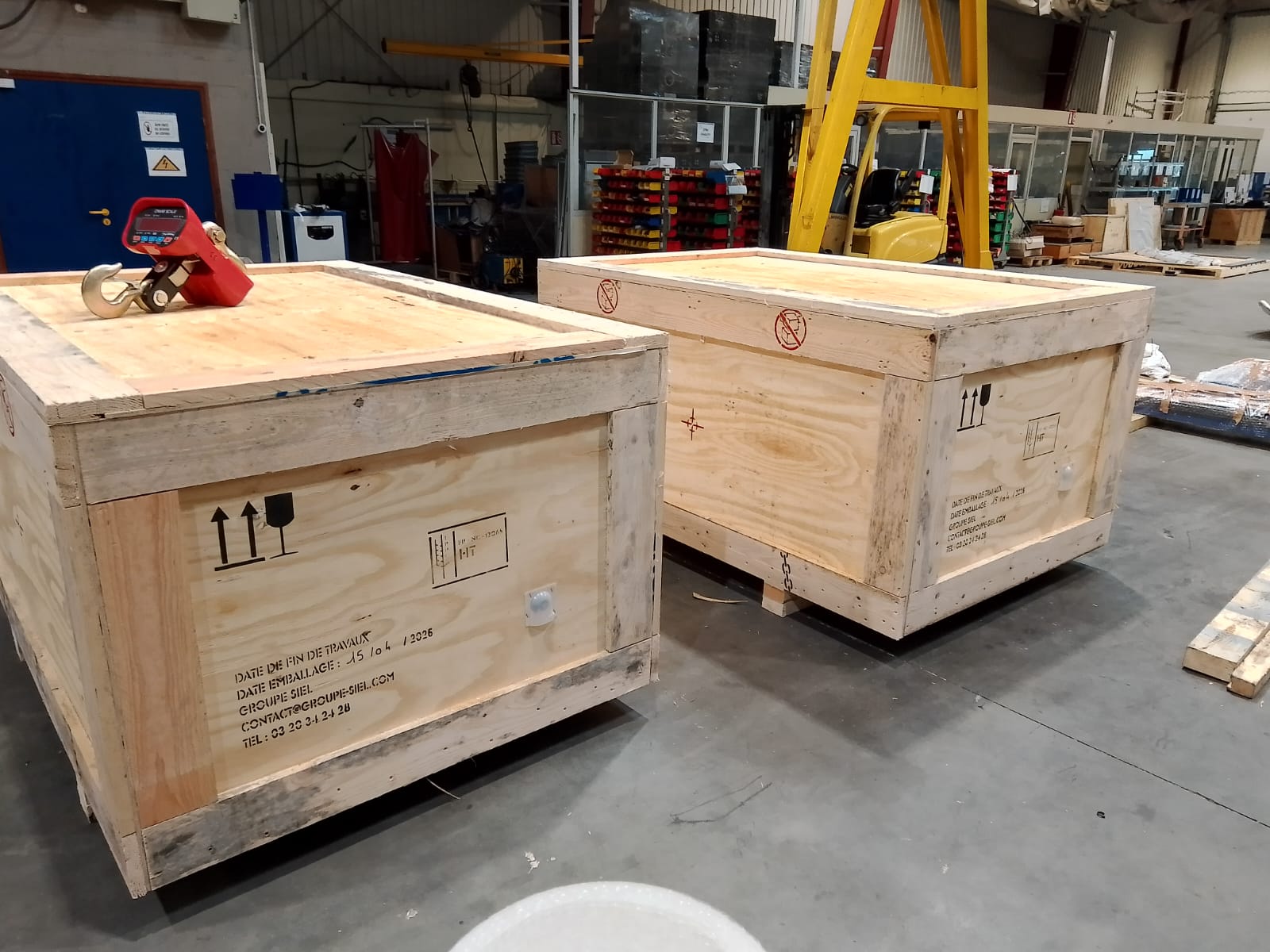 Nous disposons d’un atelier de 5000 m² couvert, de 2 ponts de levages de 5 tonnes chacun, mais aussi de chariots élévateurs, tout cela afin de pouvoir protéger et emballer vos pièces industrielles de la manière la plus optimale possible.